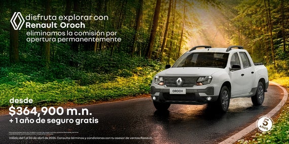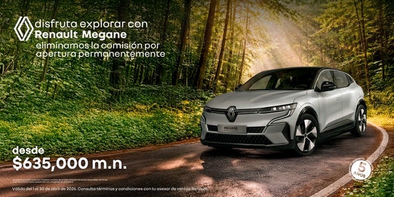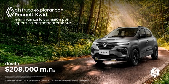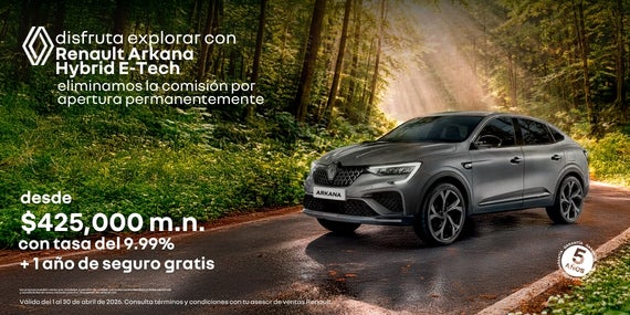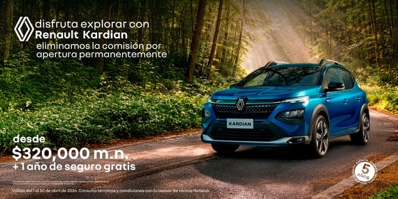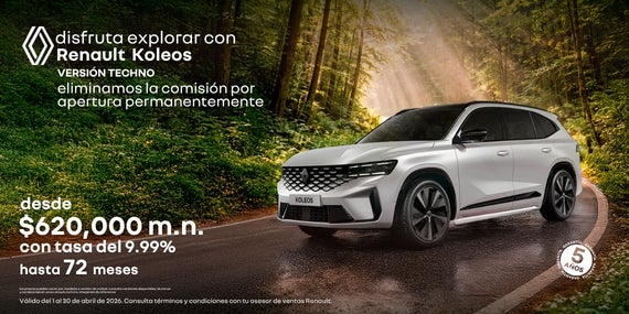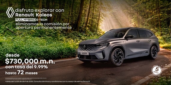 Atrévete a explorar con la máxima eficiencia y lujo en la Renault Koleos Full Hybrid E-Tech, la SUV que combina tecnología híbrida avanzada, confort premium y un diseño sofisticado. Como beneficio permanente, eliminamos la comisión por apertura en tu financiamiento. Adquiérela con un precio desde $730,000 MXN y una tasa preferente del 9.99% a plazos de hasta 72 meses. Elegancia, sostenibilidad y espacio familiar en cada viaje. Oferta válida del 1 al 30 de abril de 2026.
