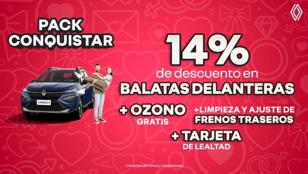 Conquista la seguridad en cada frenado con nuestro Pack Conquistar. Obtén un 14% de descuento en balatas delanteras, aplicación de ozono gratuita para desinfección interior y limpieza y ajuste completos de frenos traseros. Además, suma los beneficios de la Tarjeta de Lealtad. Mantén tu sistema de frenos en óptimas condiciones y viaja con la tranquilidad de un rendimiento confiable y seguro. ¡Protege tu trayecto y a quienes van contigo!