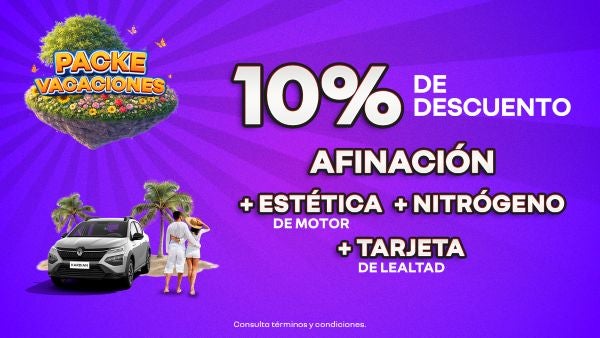 Prepara tu auto para las vacaciones con nuestro Pack Vacaciones, pensado para que viajes seguro y sin preocupaciones. Obtén un 10% de descuento en afinación completa, limpieza estética profunda del motor y aplicación de nitrógeno en tus llantas para mayor durabilidad y rendimiento. Además, suma los beneficios de la Tarjeta de Lealtad. Optimiza el desempeño de tu vehículo y disfruta al máximo cada destino.
