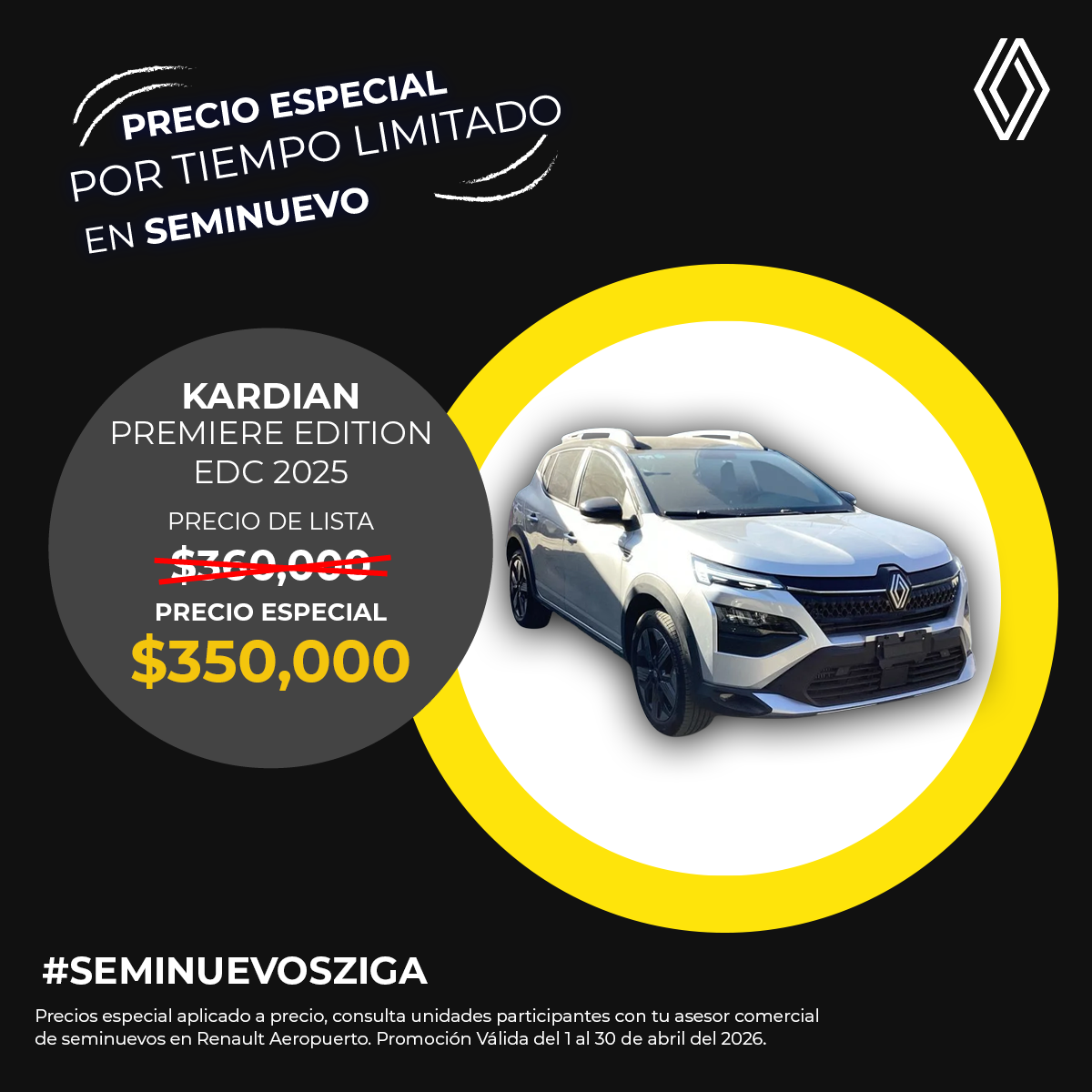 El precio mostrado ya incluye el bono aplicado. Válido únicamente para Renault Kardian Premiere Edition EDC modelo 2025 seminuevo.