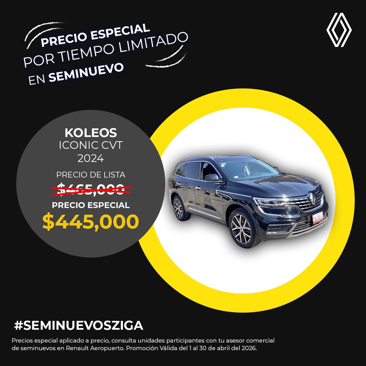 El precio mostrado ya incluye el bono aplicado. Válido únicamente para Renault Koleos Iconic CVT modelo 2024 seminuevo.