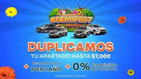Celebra el SemiFest y estrena el seminuevo que siempre quisiste con beneficios increíbles. Aprovecha la promoción donde duplicamos tu apartado hasta $7,000, además de incluir respaldo total por 1 año para mayor tranquilidad y 0% comisión por apertura en tu financiamiento. Calidad, confianza y ahorro en un solo evento. ¡No te lo pierdas!