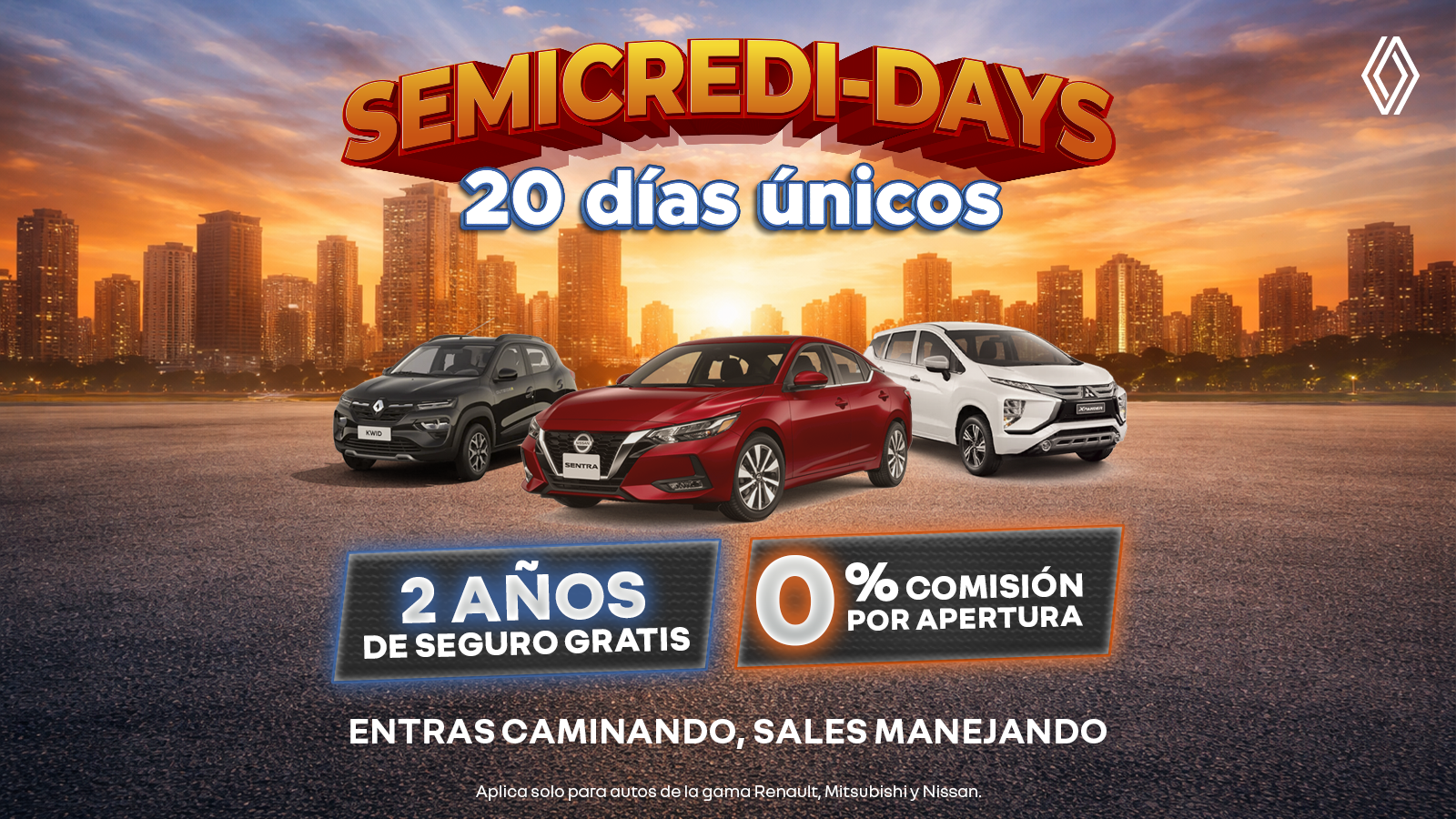 Aprovecha los Semicredi Days, 20 días únicos para llevarte el seminuevo que siempre quisiste. Disfruta de 2 años de seguro gratis y 0% comisión por apertura en tu financiamiento. Entras caminando y sales manejando, con la confianza y el respaldo para autos de las gamas Renault, Mitsubishi y Nissan. Calidad, protección y facilidad en un solo evento.