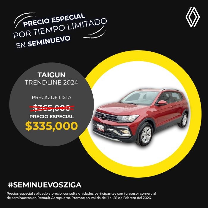 El precio mostrado ya incluye el bono aplicado. Válido únicamente para Volkswagen Taigun Trendline modelo 2024 seminuevo.